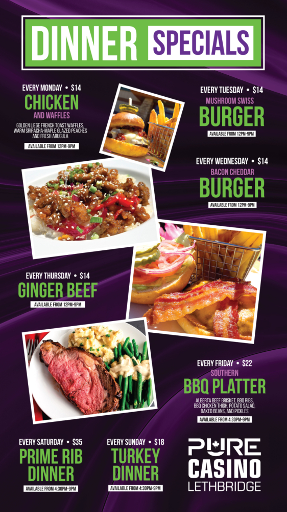 Our menu has something for everyone, from breakfast favorites to indulgent desserts. And with dining promotions happening every day at Pure Casino Lethbridge, this is where the action is. Come join us and see what delicious options are waiting for you.